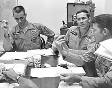 Throughout the Mercury and Gemini programs, McDonnell Aircraft engineer Guenter Wendt led the spacecraft launch pad teams, with ultimate responsibility for condition of the spacecraft at launch. He earned the astronauts' respect and admiration, including Schirra's.[35] However, the spacecraft contractor had changed from McDonnell (Mercury and Gemini) to North American (Apollo), so Wendt was not the pad leader for Apollo 1.[36] So adamant was Schirra in his desire to have Wendt back as pad leader for his Apollo flight, that he got his boss Slayton to persuade North American management to hire Wendt away from McDonnell, and Schirra personally lobbied North American's launch operations manager to change Wendt's shift from midnight to day so he could be pad leader for Apollo 7. Wendt remained as pad leader for the entire Apollo program.[36] When he departed the spacecraft area as the pad was evacuated prior to launch, after Cunningham said, "I think Guenter's going", Eisele responded "Yes, I think Guenter went."[lower-alpha 2][37][38][39][40]