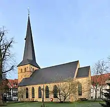 The church marks the centre of the former church village, which was the nucleus of the later town of Gütersloh. Already around 800 a wooden chapel could have stood here. The first stone church dates from 1201. A few wall remains are still preserved in the tower of today's church, the rest burned down at the beginning of the 16th century.[2]
