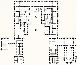The première antichambre or salon du grand couvert (also known during the reign of Louis XIV as la salle ou le roy soupe), opened with three windows onto the cour de marbre (north) and with three windows onto the cour de la reine (south).[5][6] The decoration of the room consisted of battle scenes by Joseph Parrocel with the "Battle of Arbela" being displayed over the mantelpiece.[7] After the death of the queen and the dauphine, the room served for those occasions during which Louis XIV dined alone in public. For the grand couvert, a table with a single armchair was dressed before the fireplace. The wall opposite the fireplace originally contained a tribune for musicians, but this was suppressed in the 18th century.[6][8][9]