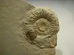 An aptychus is a type of marine fossil. It is a hard anatomical structure, a sort of curved shelly plate, now understood to be part of the body of an ammonite. Paired aptychi have, on rare occasions, been found at or within the aperture of ammonite shells. The aptychus was usually composed of calcite, whereas the ammonite shell was aragonite.