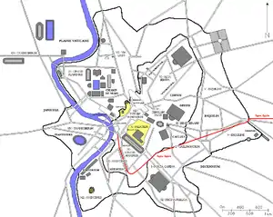 After entering the hilly area of Rome, the aqueduct alternated between tunnels through the Caelian and Aventine Hills and an elevated section. A detailed modern model of ancient Rome shows the aqueduct running along the top of the Servian Wall above the Porta Capena.[2] It dropped only 10 metres (33 ft) over its entire length, making it a remarkable engineering achievement for its day.