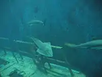 The largest aquarium is called "Fosse Aux Requins" which houses sharks and rays. It contains a false shipwreck in polyurethane resin (the iron would have rusted and the rust is toxic to fishes). Its glass is 23 centimetres thick to resist the water pressure.