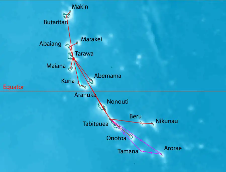 Aranuka is by tradition the island in the middle of Kiribati and the location for the formation and separation of all the islands of Kiribati which was first started by the God of our Ancestors, Nareau. That is why Aranuka was formerly named and known as Ananuka – the middle of it.[3]
