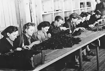 ![]() Mainly female slave labour at a German rifle factory, occupied Poland. An estimated 2,500 German companies employed forced labour during World War II [1] | |