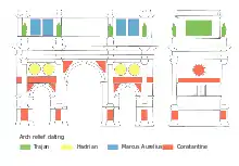 The stylistic references to the earlier arches of Titus and Septimius Severus, together with the incorporation of spolia from the times of other earlier emperors may be considered a deliberate tribute to Roman history.[24]