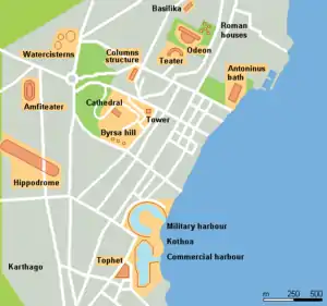 The two inner harbours, named cothon in Punic, were located in the southeast; one being commercial, and the other for war. Their definite functions are not entirely known, probably for the construction, outfitting, or repair of ships, perhaps also loading and unloading cargo.[24][25][26] Larger anchorages existed to the north and south of the city.[27] North and west of the cothon were located several industrial areas, e.g., metalworking and pottery (e.g., for amphora), which could serve both inner harbours, and ships anchored to the south of the city.[28]