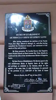 Espiritu Santo Parish, now known as the Archdiocesan Shrine and Parish of Espiritu Santo, is a Roman Catholic parish belonging to the Archdiocese of Manila that is located along Tayuman Street corner Rizal Avenue, Santa Cruz, Manila, Philippines. It was declared an Archdiocesan Shrine by Manila Archbishop Emeritus Luis Antonio G. Cardinal Tagle on June 8, 2014, the Solemnity of the Pentecost. Rev. Fr. Wilmer R. Rosario, JCD is the present parish priest and rector of the church, succeeding Rev. Msgr. Albert G. Salonga, PC, who has been its parish priest from 1998 to 2015.[1][2]