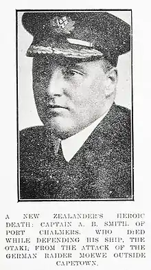 Smith received this award for his action as Master of the New Zealand Shipping Company cargo ship Otaki. On 10 March 1917 in the Atlantic Ocean, Otaki, armed with one 4.7-inch gun, sighted the German merchant raider SMS Möwe, which was armed with four 150 mm, one 105 mm and two 500 mm torpedo launches[2] guns.