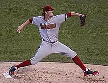 After attending spring training with the Diamondbacks, Bradley was assigned to the Triple-A Reno Aces at the beginning of the 2014 season.[20] His agent pushed for Bradley to be called up to the majors, arguing that Bradley was only being kept in the minor leagues to allow the Diamondbacks to retain his original contract for a longer period of time. Diamondbacks general manager Kevin Towers said that promoting Bradley would put unnecessary pressure on the pitcher, as the team had the worst ERA in the MLB, and Towers told Fox Sports that, "I know how it would be perceived if he came up: 'Archie is going to save us.'"[21] Bradley missed nearly two months of the 2014 season after sustaining an elbow injury in late April. He began making rehab assignments at the end of June, with a 75-pitch limit.[22] In only 18 season appearances and 83 innings, Bradley posted a 3–7 record, a 4.45 ERA, and 75 strikeouts in 2014.[14]