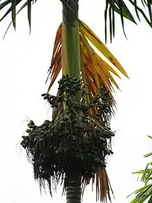 The areca nut tree grows as a single stem, and has generally a height of about 30 metres (98 ft). The fruit, which bears the nut, is orange coloured and is in the shape of an egg or oval shape; it holds a hard single seed.[2]