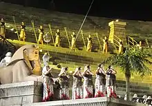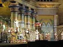 In addition to singers, directors and designers added distinguishing elements to productions such as the 1953 water pool created for Aida by silent cinema director Georg Wilhelm Pabst. His aim was to conjure up the image of the Nile on which little Egyptian boats could sail, and the idea was adapted by Pier Luigi Pizzi again in Aida in 1999. Also, it was Pabst who was responsible for the introduction of a great number of animals on stage, including elephants, horses and dromedaries, and this form of spectacle has become a prominent feature of many opera productions in Verona.