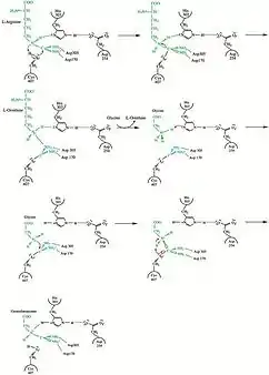 The actual reaction catalyzed by AGAT is the synthesis of guanidinoacetate from arginine and glycine, with ornithine as a byproduct. The guanidinoacetate produced is then combined with S-Adenosyl-L-methionine, a reaction catalyzed by GAMT, to produce creatine and S-Adenosyl-L-homocysteine. The mechanism by which the AGAT catalyzes this committed step follows a ping-pong mechanism, and involves the transferring of an amidino group to the Cys407 residue on the protein from L-arginine, which leaves as L-ornithine. The His303 residue then extracts a proton from glycine, which then picks up the amidino group from Cys407 in exchange for a proton to become guanidinoacetate and renew the catalyst.[2]
