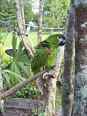 The Arini tribe of the neotropical parrots is a monophyletic clade of macaws and parakeets (commonly called conures in aviculture) characterized by colorful plumage and long, tapering tails. They occur throughout Mexico, Central America, and South America, and formerly the Caribbean and North America. One genus and several species are extinct; another genus is extinct in the wild. Two species are known only through subfossil remains. About a dozen hypothetical extinct species (see Extinct Caribbean macaws) have been described, native to the Caribbean area.[1][2] Among the Arini are some of the rarest birds in the world, such as Spix's macaw, which is extinct in the wild – fewer than 100 specimens survive in captivity. It also contains the largest flighted parrot in the world, the hyacinth macaw. Some species, such as the blue-and-yellow macaw and sun conure are popular pet parrots.
