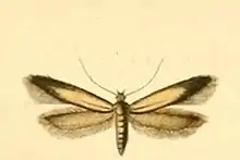 The wingspan is 10–13 mm.[3] The forewings are bronzy-black, somewhat lighter basally; a nearly straight narrow white fascia beyond middle. Hindwings fuscous, darker posteriorly. Under-surface with white fascia distinct across forewings and forming a costal spot on hindwings.The larva is pale ochreous-yellowish ; 3-12 with broad dull red transverse bands, on 3 and 4 somewhat interrupted ; head yellow - brown ; plate of 2 yellow brown, posteriorly blackish marked.[4]