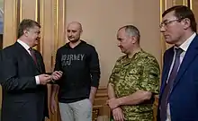 The next day, Babchenko appeared alive and well on live Ukrainian television at a press conference held by the Security Service of Ukraine (SBU).[32] Babchenko had collaborated with the SBU for a month, conducting a secret operation.[33][34][35] According to the SBU, the murder had been staged to expose Russian agents.[2][36][37] Previously in Kyiv, vocal critics of Vladimir Putin, journalist Pavel Sheremet and politician Denis Voronenkov, had been assassinated in 2016.[2][38][39][40] Babchenko's wife said she knew her husband's death would be staged.[41] The SBU also said it had detained a Ukrainian suspect[2] (allegedly recruited by a Russian intelligence official), and an accomplice,[9] who was engaged in preparations for the contract killing of Babchenko.[42][43] The alleged assassin was reported to be helping the SBU with its investigation.[44] According to SBU head Vasyl Hrytsak, those who had wanted to assassinate Babchenko had been planning to kill 30 people in Ukraine.[45] The SBU claimed to have discovered this plot when one of the men approached to kill Babchenko revealed the plot to the security services.[2] Allegedly several people, including Ukrainian war veterans, had been offered for the contract killing.[2]