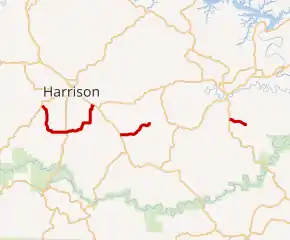 The Arkansas General Assembly passed the Act 148 of 1957, the Milum Road Act, creating 10–12 miles (16–19 km) of new state highways in each county.[10] As part of this system expansion, Highway 206 was created by the Arkansas State Highway Commission on July 10, 1957, between Gaither and Bellefonte.[1] The alignment was slightly revised west of Highway 7 on January 28, 1959,[11] and extended west to Highway 43 on June 29, 1960.[12] The second Boone County segment was designated on March 28, 1973, in response to the Arkansas General Assembly's Act 9 of 1973,[13] which directed county judges and state legislators to designate up to 12 miles (19 km) of county roads as state highways in each county.[10] The Marion County segment was created two months later in response to the same act.[14]