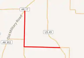 Highway 241 was created by the Arkansas State Highway Commission on July 10, 1957 as a highway of 5.6 miles (9.0 km) between Clarendon and Keevil.[2] The Commission later modified the previous order, extending the highway by 3.4 miles (5.5 km) on February 26, 1958.[4] The route was extended east to Highway 17 at Keevil on July 2, 1960,[5] and to US 49 and Highway 39 on June 23, 1965.[6] On January 26, 1977, the north-south portion of the highway to Clarendon was redesignated as Highway 302 to improve route designation continuity, leaving the remaining segments of east–west section line road with an odd-numbered designation normally indicative of north–south routes.[7]
