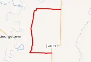 Highway 261 begins at Highway 33 near Dixie, an unincorporated community in western Woodruff County near the Cache River National Wildlife Refuge. The highway runs due west (though signed east) as a section line road across flat fields used for row crops, turning north at McClelland and passing a camp or lodge. The highway begins running north, roughly 1 mile (1.6 km) east of the White River, which also serves as the White County line. Highway 262 turns east and terminates at an intersection with Highway 33 north of Gregory.[5]