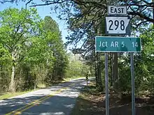 Highway 298 (AR 298, Ark. 298, and Hwy. 298) is a designation for three state highways in Lower Arkansas. The eastern segment of 3.71 miles (5.97 km) begins at Sims at Highway 88 and runs southeast to US Route 270 (US 270). A middle segment of 28.39 miles (45.69 km) runs from Highway 27 at Story east to Highway 7.[1] A segment in Saline County of 13.81 miles (22.23 km) runs east from Highway 9 to Highway 5 near Benton.[2]