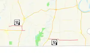 The third segment of Highway 52 begins at US 165 (Main Street) in Wilmot, a small town in eastern Ashley County. The highway runs east into Chicot County, where it becomes a section line road.[8] Continuing east, Highway 52 passes swampland and fish hatcheries before it bridges the Boeuf River. The route terminates at a junction with AR 159 at the unincorporated community of Indian approximately three miles (4.8 km) north of Louisiana.[10]