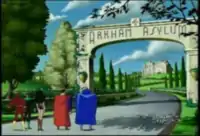 - In Batman Beyond: Return of the Joker, the final battle between the original Batman and the Joker is seen taking place at an abandoned and partially demolished Arkham. It is also the same place where Robin, who was earlier kidnapped, then brainwashed and disfigured into resembling a younger version of the Joker, kills the real Joker (either by shooting him with the bang-flag speargun or by pushing him into a tank of water and a mass of wires, causing him to electrocute himself, depending on which version is being seen). A deleted scene, featured on both versions of the DVD as a special feature, has Bruce Wayne touring the abandoned Arkham, where Bruce Wayne's successor as Batman, Terry McGinnis, follows and sees the Joker's corpse hanging with a sign on it saying "I Know". Barbara Gordon states that the inmates and facilities had shifted to a newer location sometime prior to Joker's death, with the Batman Beyond episode "Splicers" also confirming the fact.
