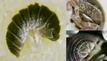 | Various views of an Armadillidium atticum specimen: Lateral view of the whole body (left), close-up of the head (above right) and close-up of the telson (below right). | |