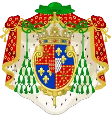A Coat of Arms with cartel: in 1 and 4: Gules with golden chains laid in an orle, cross and saltire, loaded in the heart of a natural emerald (which is from Navarre); in 2 and 3: azure with three fleurs de lys d'or (which is from France); on the whole, gone: in 1: Gules with nine twins of gold, placed 3, 3, 3 (which is Rohan); and in 2: of ermine (which is from Brittany).