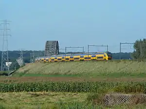The Arnhem–Nijmegen railway is an important railway line in the Netherlands running from Arnhem to Nijmegen, passing through Elst. The line was opened in 1879. It crosses two branches of the river Rhine: the Nederrijn in Arnhem, and the Waal in Nijmegen.
