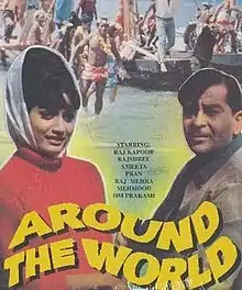 Around the World is a 1967 Indian Hindi-language romantic comedy film written and directed by Pachhi. It stars Raj Kapoor as an Indian who travels around the world with five thousand rupees. The film also starred Rajshree, Ameeta, Om Prakash, and Mehmood. It was India's first film to be released in 70 mm format and was shot all around the world.