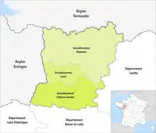 - Arrondissement of Mayenne, (subprefecture: Mayenne) with 132 communes.[3] The population of the arrondissement was 121,682 in 2014.