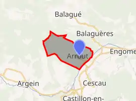 Arrout is a commune in the Pyrenees mountains in the former province of Couserans some 12 km south-west of Saint-Girons and 3 km north of Castillon-en-Couserans. Access to the commune is by a country road from the end of the D404, which comes from Cescau in the south-east, to the village or by the Chemin d'Arrout from Audressein in the south. There is also a country road from Alas in the north-east. The commune is rugged and heavily forested throughout.[4]