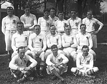 Early in the season, England played The South at Twickenham, winning 21–12, with outstanding performances from Dingle, as well as Johnson and Poulton.[15] Dingle then played in the third and final trial against the Rest of England, which England won 42–27.[16] His selection for the Five Nations came up for the match against Scotland,[3] replacing Roberts on the left wing, who had had a poor game in the prior encounter against Ireland. Before the Scotland match on 21 March, Bill Maclagan described the English team as one of the best to visit Scotland.[17] Having already defeated Wales and Ireland, England beat Scotland 15–16 in a close-fought game. Scotland, with the wind behind them, opened the scoring in the first half with a try but England equalised just before half time. After the break, England got up a lead of 6–16 and victory seemed certain. Scotland responded and closed the gap to one point. After Cherry Pillman's leg was broken in a tackle, England were playing with fourteen men, but they managed to hold on, thereby winning both the Triple Crown and the Calcutta Cup, as well as the Five Nations Championship.[18] Dingle, in the opening minutes, missed a try-scoring opportunity when he knocked-on a pass from Poulton. Yet he had a positive impact in other parts of the game.[19] It was England's last international test on British soil before the First World War: 11 of the 30 players went on to be killed in it, including the Scotsman William Middleton Wallace,[20] who died the same day as Dingle.[21]
