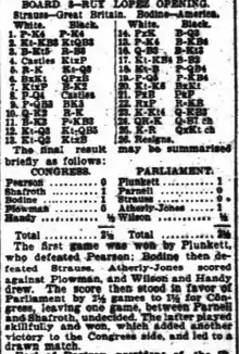 Strauss also enjoyed playing chess and was a member of a House of Commons International Chess Team which played against a team of players from the United States House of Representatives. The team played chess games by transmitting moves through a transatlantic cable. In one match against the United States House of Representatives, Strauss lost his match against Bodine, but the teams drew with 2½ points each.[13]