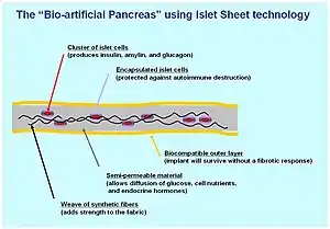 The San Diego, California based biotech company ViaCyte has also developed a product aiming to provide a solution for type 1 diabetes which uses an encapsulation device made of a semi-permeable immune reaction-protective membrane. The device contains pancreatic progenitor cells that have been differentiated from embryonic stem cells.[30][31] After surgical implantation in an outpatient procedure, the cells mature into endocrine cells which arrange in islet-like clusters and mimic the function of the pancreas, producing insulin and glucagon.[32][33] The technology advanced from pre-clinical studies to FDA approval for phase 1 clinical trials in 2014, and presented two-year data from the trial in June 2018.[30][31] They reported that their product, called PEC-Encap, has so far been safe and well tolerated in patients at a dose below therapeutic levels. The encapsulated cells were able to survive and mature after implantation, and immune system rejection was decreased due to the protective membrane. The second phase of the trial will evaluate the efficacy of the product.[30] ViaCyte has also been receiving financial support from JDRF on this project.[33]