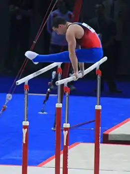 The parallel bars consist of two bars slightly further than shoulder's width apart and usually 1.75 m (5.7 ft) high. Gymnasts execute a series of swings, balancing moves, and releases that require strength and coordination.