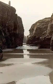Praia das Catedrais (Spanish: playa de las Catedrales, English: Beach of the Cathedrals) is on the northwest coast of Spain. It is the name given by the tourism industry to Praia de Augas Santas (translated from Galician: 'Beach of the Holy Waters'). The beach is located in the Ribadeo municipality, in the province of Lugo (Galicia), on the Cantabric coast, and it lies about ten kilometres to the west of the town of Ribadeo. Its name is derived from its cliff formations.