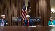 In August 2021, Hutchinson signed bills into law that prohibited businesses and government facilities from requiring proof of COVID-19 vaccination for staff and customers to enter facilities.[35] While Arkansas was experiencing a wave of COVID-19 cases, he also signed a bill into law that prohibited state and local officials from enacting mask mandates.[36] He later said that he regretted doing so.[36] In December 2021, Hutchinson praised president Biden's COVID policies and thanked Biden for his efforts to "get the vaccinations out" and for "depoliticizing" the federal COVID response.[37][38] In January 2022, Hutchinson encouraged large businesses to not comply with the Biden administration's vaccine requirements.[39]