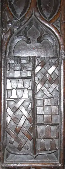 A late 16th century[20] stone heraldic mural monument of Richard Bellew of Ash survives in Braunton Church, on the south aisle wall. It is said to have been taken from the former chapel at Ash.[21] It is a triptych split by use of superimposed orders of short Ionic columns into three rows and seven compartments. Within six of the compartments are escutcheons with heraldry sculpted in relief. The painted inscription and all painted colouring have been lost. It shows Richard's own shield at bottom centre, that of his father at top and on both sides in total 4 further shields of his father (again), grandfather, great-grandfather and great-great-grandfather.