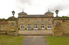 The park, covering some 200 acres (0.81 km2) and including three large lakes around the house, was laid out by the landscape architect Capability Brown in the mid-18th century. Brown's orangery, c. 1767, houses the oldest camellia in England.[4] Brick external additions were made to the house in Gothic Revival style in 1813–17,[1] by a third John Ashburnham, the second earl of Ashburnham, to designs by George Dance the Younger. Robert Adam designed entrance lodges for the second Earl in 1785.[5] George Ashburnham, 3rd Earl of Ashburnham, commissioned architectural drawings from John Soane, but it is not known if the suggested additions, including a porte-cochere, were built. The house was refaced in stone in the early 19th century, and then, when fashions changed, a second, red brick outer skin was added in 1853.[6]