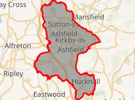Ashfield (/ˈæʃˌfiːld/) is a local government district in western Nottinghamshire, England. The population of Ashfield was 127,200 in 2018.[2] The district is mostly urban and contains parts of both the Nottingham Urban Area and the Mansfield Urban Area. There are three towns in the district; Sutton-in-Ashfield, Kirkby-in-Ashfield and Hucknall. The largest being Sutton-in-Ashfield. Towns and villages in the district include the following: