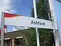 Although the station signage displays only Ashford, the station is referred to in timetables, and as printed on railway tickets, either as Ashford (Surrey), or Ashford (Middlesex) (from the historic county), in order to differentiate it from Ashford International railway station in Kent.[1][2][3]