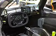The interior design was leaked online on 20 June 2017 and gave a preview of the car's design. The interior has no gauge cluster, but rather a collection of screens. By the left and right corners are the screens for the camera side mirrors. One screen sits at the top of the center console, which may have a collection of live vehicle information, and regular vehicle controls, but this is not confirmed. A screen is used on the race-inspired steering wheel and acts as the driver gauge cluster. Dials and switches sit beside the wheel screen to allow for easier changes without driving interruption. The seats, formed from hollow carbon fibre straight into interior perimeter, are bucket variants, and have two seat belts for each car seat.[20]