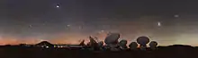 Infrared astronomy is founded on the detection and analysis of infrared radiation, wavelengths longer than red light and outside the range of our vision. The infrared spectrum is useful for studying objects that are too cold to radiate visible light, such as planets, circumstellar disks or nebulae whose light is blocked by dust. The longer wavelengths of infrared can penetrate clouds of dust that block visible light, allowing the observation of young stars embedded in molecular clouds and the cores of galaxies. Observations from the Wide-field Infrared Survey Explorer (WISE) have been particularly effective at unveiling numerous galactic protostars and their host star clusters.[49][50] With the exception of infrared wavelengths close to visible light, such radiation is heavily absorbed by the atmosphere, or masked, as the atmosphere itself produces significant infrared emission. Consequently, infrared observatories have to be located in high, dry places on Earth or in space.[51] Some molecules radiate strongly in the infrared. This allows the study of the chemistry of space; more specifically it can detect water in comets.[52]