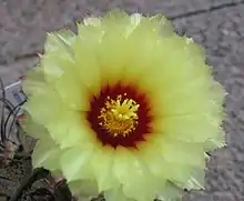 Astrophytum capricorne, the goat's horn cactus, is a species of flowering plant in the cactus family Cactaceae, that is native to the Coahuila regions of Northern Mexico.[2] Growing to 25 centimetres (9.8 in) tall by 10 centimetres (3.9 in) wide in a ball or oval shape, it is grey-green in colour with 7 to 9 prominent ribs, very long twisted spines and yellow flowers with a red centre in summer.[3]