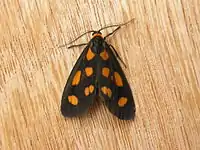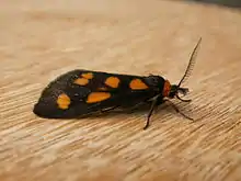 The wingspan is about 15 mm. Adults are small, slim bodied and black with five yellow spots on each forewing. There is a large yellow patch on each hindwing.[2]