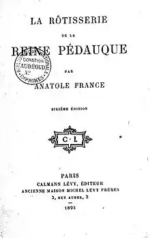 At the Sign of the Reine Pédauque (French: La Rôtisserie de la reine Pédauque) is a historical novel by Anatole France, written in 1892 and published the next year. The novel tells of the tribulations of the young Jacques Ménétrier at the beginning of the 18th century. Its most important source is the 17th-century occult text Comte de Gabalis.[1]