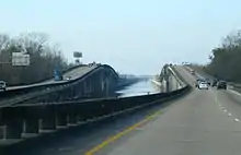 Accidents occur frequently near the two river crossings as both are very narrow and lack shoulders.[2] Accidents along the bridge can be problematic as the Atchafalaya Basin is sparsely inhabited. In 1999, Governor Mike Foster lowered the speed limit on the bridge from 70 to 60 mph (115 to 95 km/h). In 2003, the Louisiana Legislature enacted new traffic regulations for the bridge. The speed limit for 18-wheelers was lowered to 55 mph (90 km/h), and they must remain in the right lane while crossing the bridge.[3]