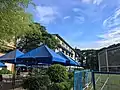 Kiosks in front of the Sauras and Xavier Halls, situated beside the campus backfield