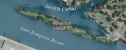 Atherton Island is a small island in the Sacramento–San Joaquin River Delta.[2][3][4][5][6] It is part of San Joaquin County, California.[7][8][9][10][11][12] Its coordinates are 37°57′22″N 121°21′01″W[1], and the United States Geological Survey measured its elevation as 13 ft (4.0 m) in 1999.[1] It appears on a 2015 USGS map of the area.[13]