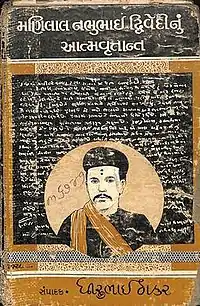 Dhruv published some edited extracts from the manuscript in his journal Vasant during 1929 to 1931 in six installments,[6] totaling about 81 pages, but he stopped publishing as soon as the agitation subsided, and then it remained unpublished. Ambalal Purani tried at least fifteen times to obtain a copy of the manuscript from Madhavlal, but was unable to. The manuscript was inherited by Dhruv's son, Dhruvbhai Dhruv after his death. Dhirubhai Thaker, who had written scholarly works on the life and works of Manilal, secured the manuscript from Dhruvbhai Dhruv for his PhD thesis. He copied it, prepared a print copy, and published it in 1979 along with the love letters of Diwalibai written to Manilal.[3][5] The book was published under the title Manilal Nabhubhai Dwivedinu Atmavrittanta.[7] It was reprinted in 1999.[1]